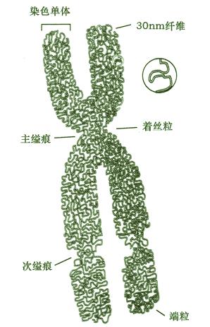 染色体是细胞核中载有遗传信息的物质,在显微镜下呈柱状或者是杆状,主要由DNA和蛋白质两种物质组成,在细胞有丝分裂时期,容易被碱性染料染色,所以称之为染色体。各种生物的染色体都有一定的数目、形状和大小。染色体含有一个叫做着丝粒的收缩点,它将染色体分为两部分,即短臂和长臂。